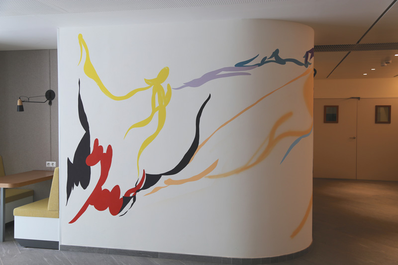 Pour son premier dossier artistique, Primonial a fait confiance à ART ESPACE qui a proposé une série de 3 fresques aux trois points clés de circulation de l’espace. Louis Granet, jeune artiste en pleine expansion, a exécuté les fresques in situ, aux contacts des locataires pendant toute la réalisation. Aujourd’hui achevés, les espaces de convivialité ont une ambiance particulièrement chaleureuse et unique, qui fait écho aux œuvres d’art installées dans les derniers étages de l’immeuble.